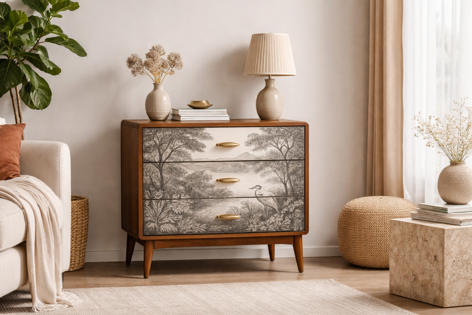 Unisce funzionalità e carattere decorativo. La struttura in legno offre solidità e durata nel tempo, mentre il fronte dei cassetti aggiunge un tocco distintivo pensato per diversi ambienti della casa.